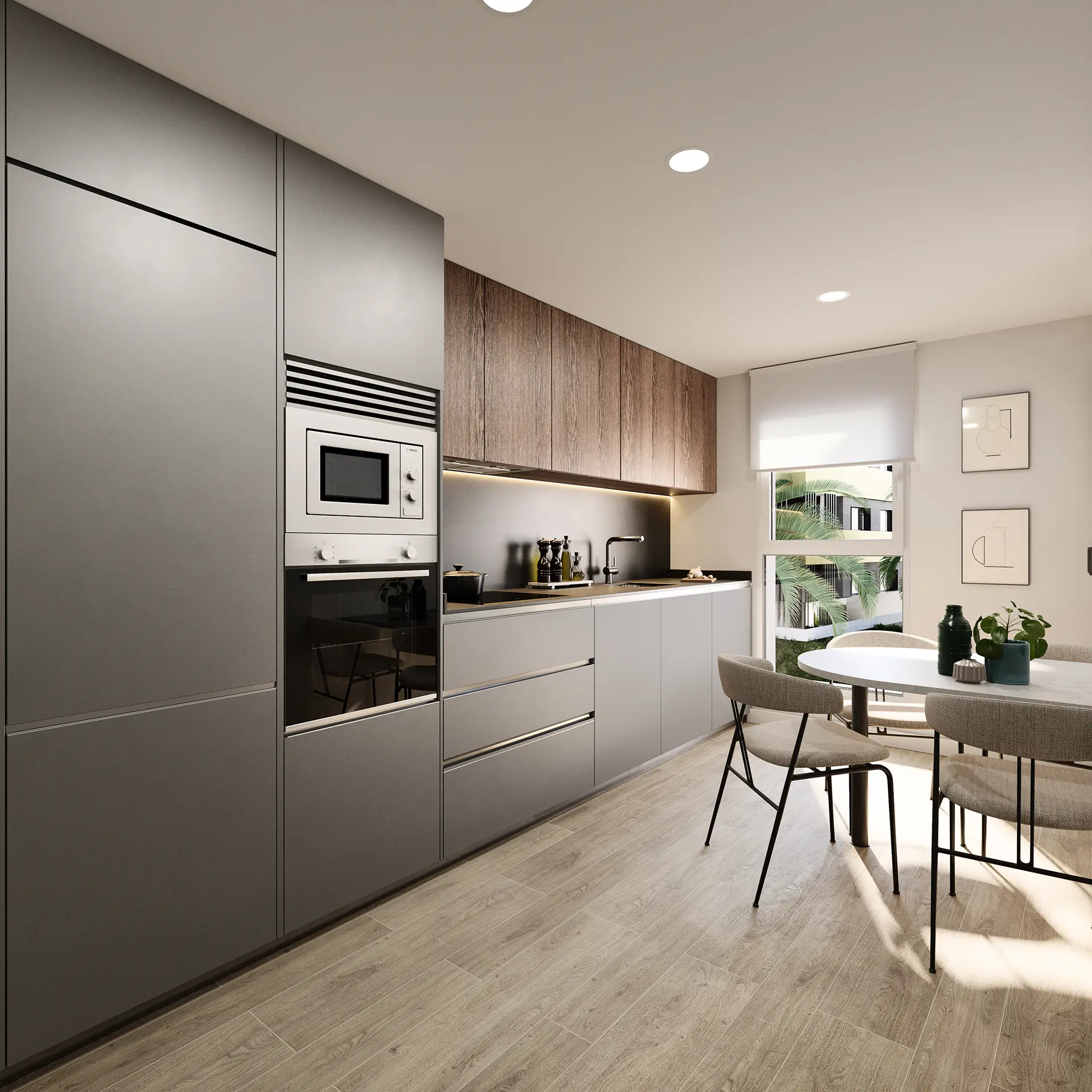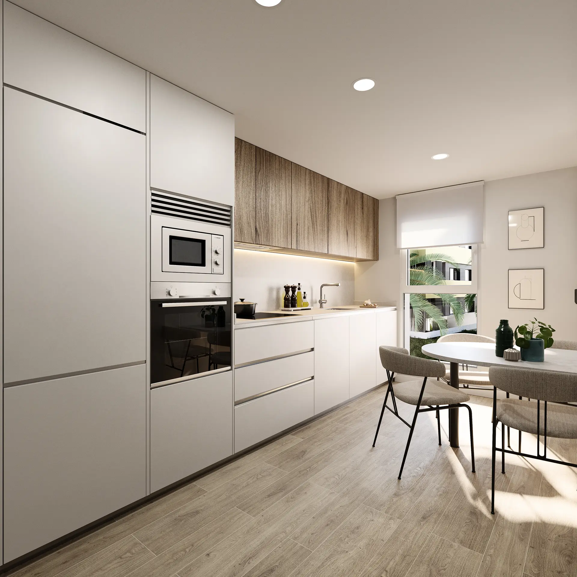 La cocina, que se entrega completamente equipada, responde a las tendencias más actuales de diseño. Disfruta de un mobiliario de alta calidad y de electrodomésticos panelados BOSCH de alta calificación energética.